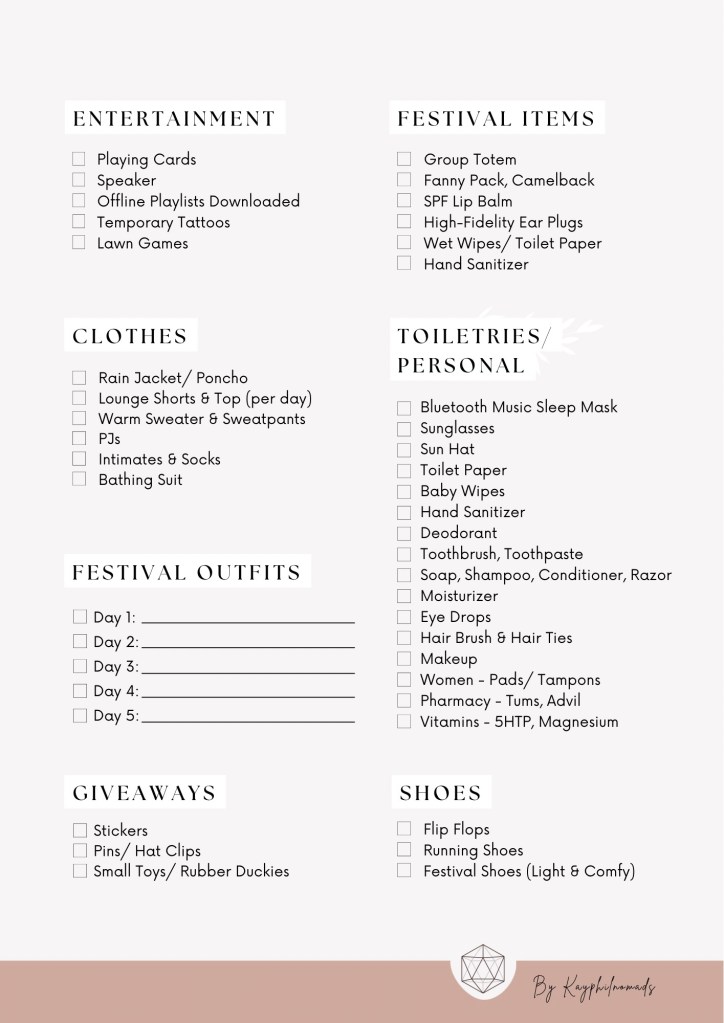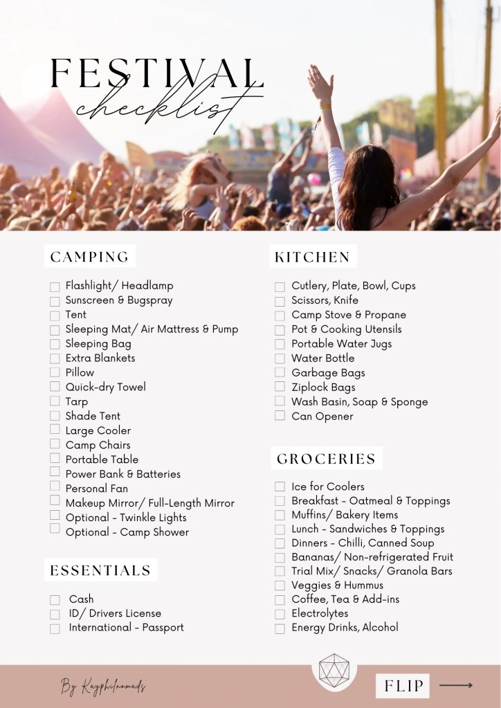 So grab a bag, your favorite festival playlist, and let’s dive into everything you’ll need to conquer your camping festival experience like a seasoned pro. Our checklist covers everything from essential camping gear to festival must-haves and, of course, the all-important sustenance to keep you fueled for those long festival days (and maybe slightly sleep-deprived nights). Our checklist is geared towards tent-camping, but can be used for van/ RV festival goers, or city folk as well. Scroll to the bottom of this post to print off your very own FREE PDF version of this festival checklist!